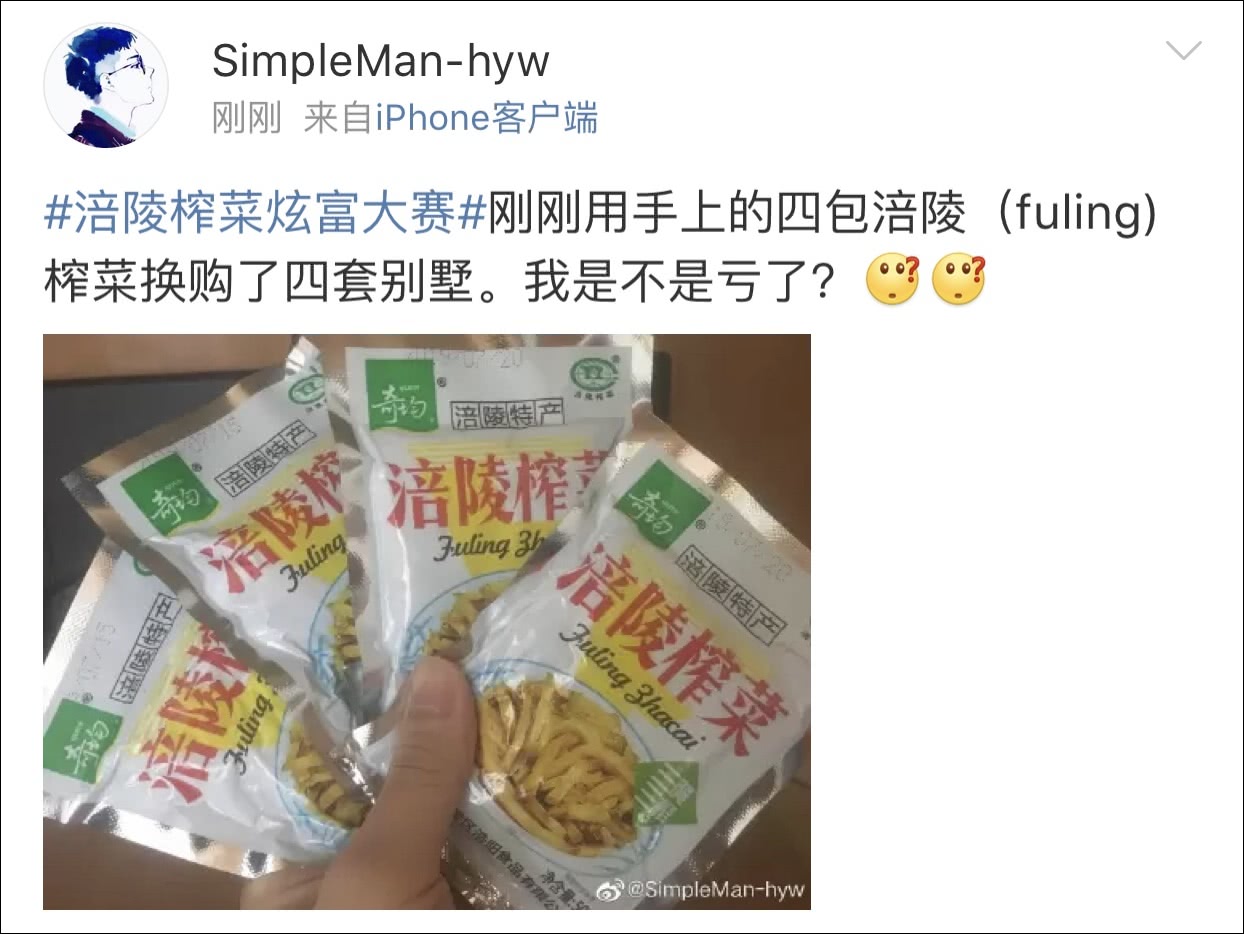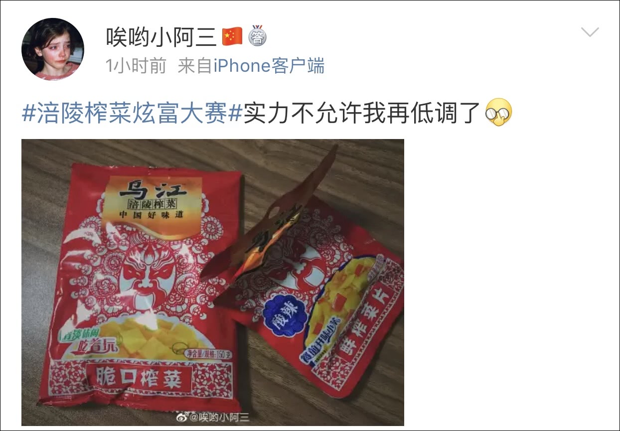 大陸網(wǎng)友們也借此在微博上玩起了“涪陵榨菜炫富大賽”。