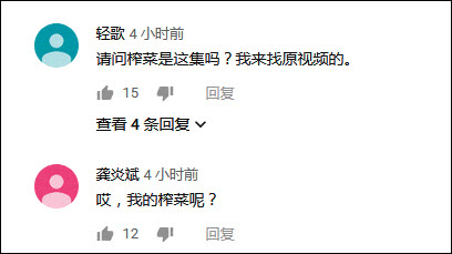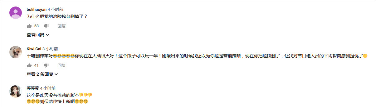 節(jié)目組的這一舉動引來了眾多網(wǎng)友的不滿,網(wǎng)友們紛紛在評論區(qū)喊話:“哎,我的榨菜呢?”“為什么把我的涪陵榨菜刪掉了?”“寶杰(節(jié)目主持人劉寶杰)上涪陵榨菜,快上”......
