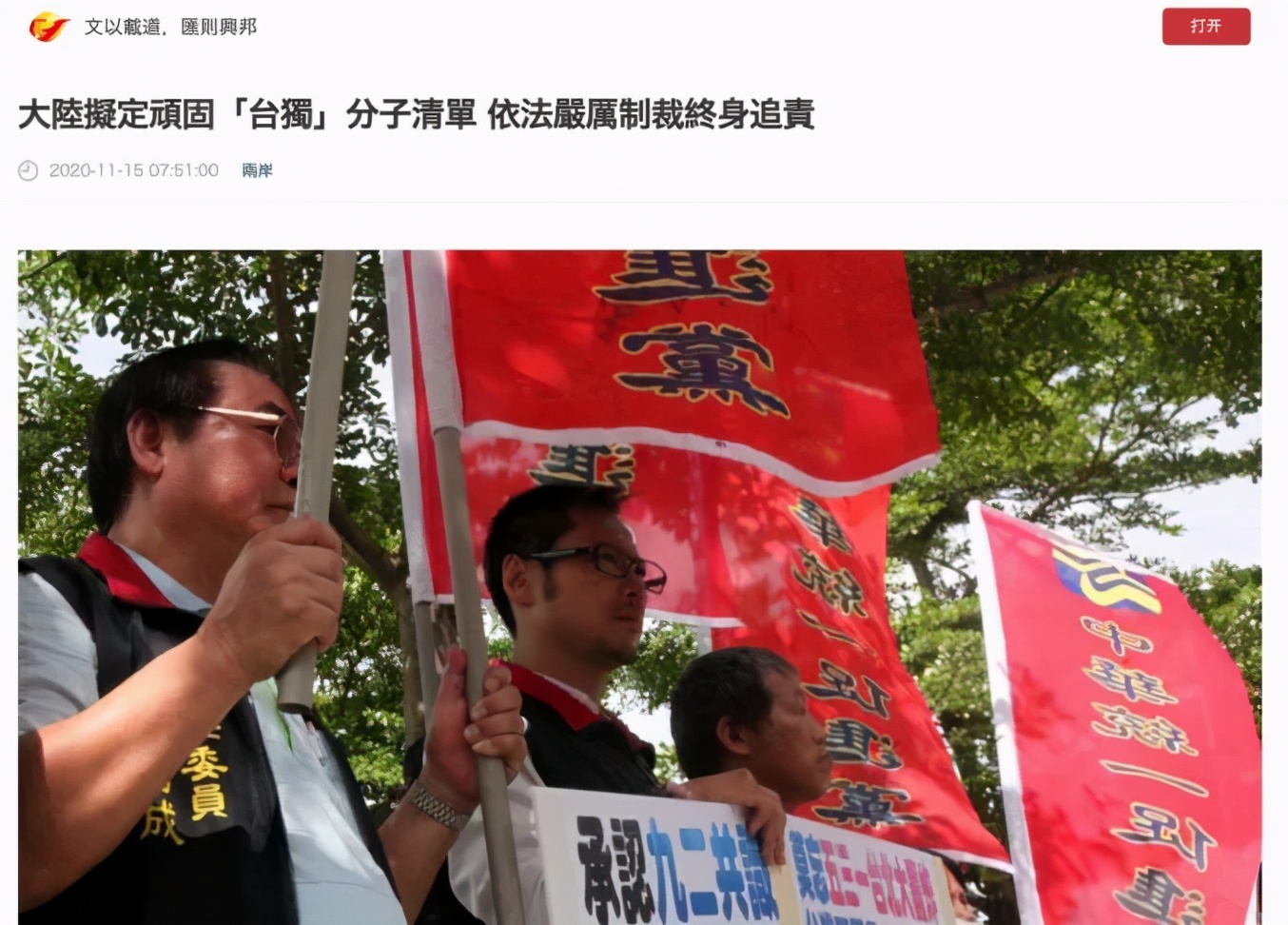 據(jù)香港《大公報》15日報道,記者從權(quán)威渠道獲悉,針對島內(nèi)外“臺獨”勢力活動猖獗、氣焰囂張,為予以有力打擊,中央有關(guān)方面正在研究制定“臺獨”頑固分子清單,對那些涉“獨”言論囂張、謀“獨”行徑惡劣的頑固分子,及其金主等主要支持者,采取嚴(yán)厲制裁等有效措施,包括依據(jù)《反分裂國家法》及《刑法》、《國家安全法》有關(guān)“分裂國家罪”等條款繩之以法,終身追責(zé)。