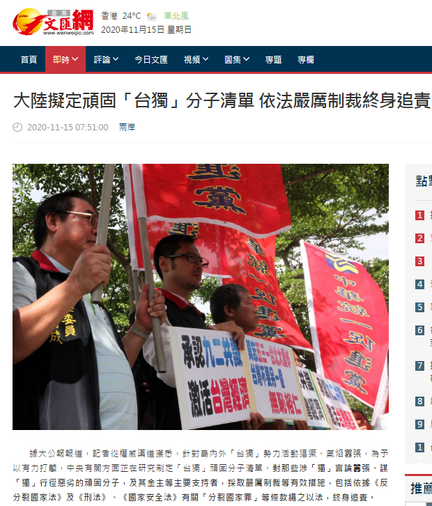 據(jù)《大公報》報道,記者從權(quán)威渠道獲悉,中央有關(guān)方面正在研究制定“臺獨(dú)”頑固分子清單,對那些涉“獨(dú)”言論囂張、謀“獨(dú)”行徑惡劣的頑固分子,及其金主等主要支持者,采取嚴(yán)厲制裁等有效措施,包括依據(jù)《反分裂國家法》及《刑法》、《國家安全法》有關(guān)“分裂國家罪”等條款繩之以法,終身追責(zé)。