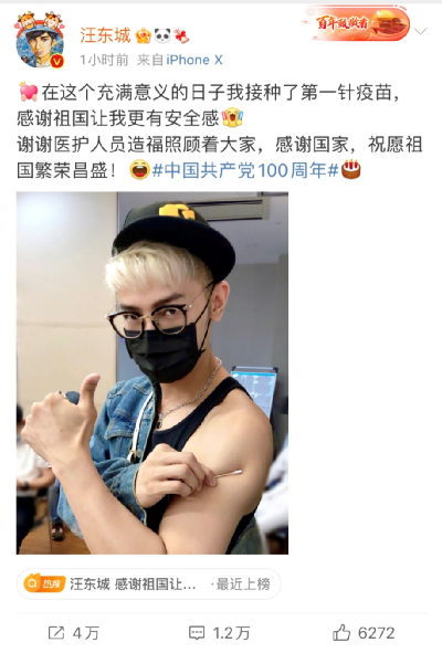 “在這個充滿意義的日子,我接種了第一針疫苗,感謝祖國讓我更有安全感。謝謝醫(yī)護人員造福照顧著大家,感謝國家,祝愿祖國繁榮昌盛!”這段文字后面,汪東城還帶上了#中國共產黨100周年#的話題。↓