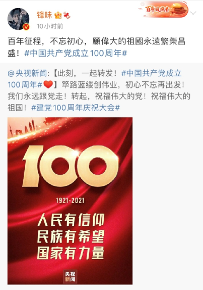 香港藝人謝霆鋒發(fā)博稱,”百年征程,不忘初心。愿偉大的祖國永遠繁榮昌盛!”↓