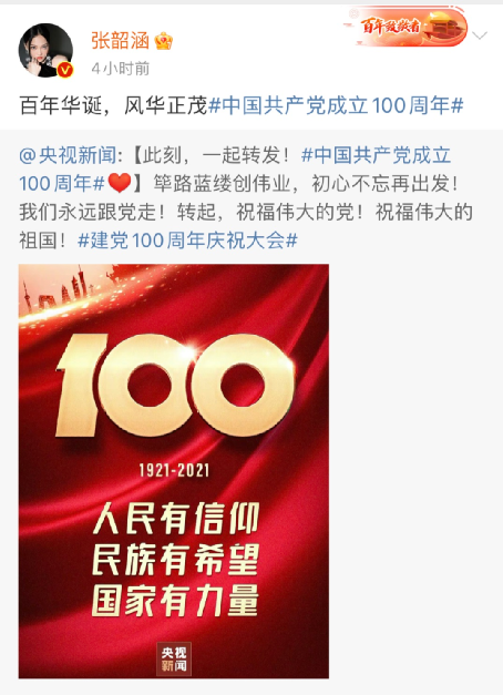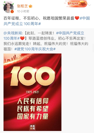 香港藝人張柏芝發(fā)博稱,“百年征程,不忘初心,祝愿祖國繁榮昌盛。”↓