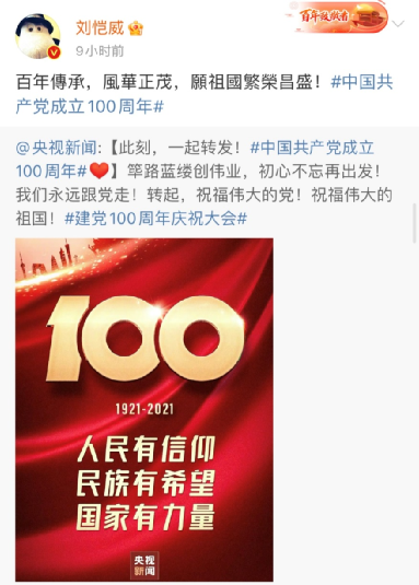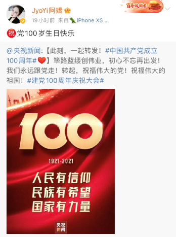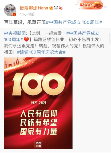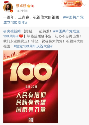 香港藝人鐘欣桐、蔡卓妍也分別發(fā)博稱,“祝黨100歲生日快樂。”“一百年,正青春,祝福偉大的祖國。”↓