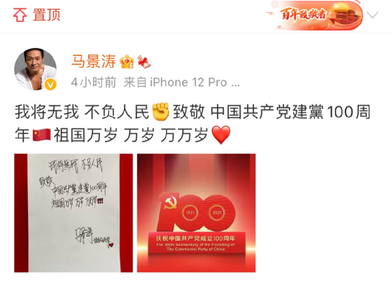 臺灣藝人馬景濤發(fā)博稱,“我將無我,不負人民。致敬中國共產黨建黨100周年。祖國萬歲,萬歲,萬萬歲。”值得一提的是,馬景濤還曬出了自己的手寫祝福并將這條微博置頂。↓