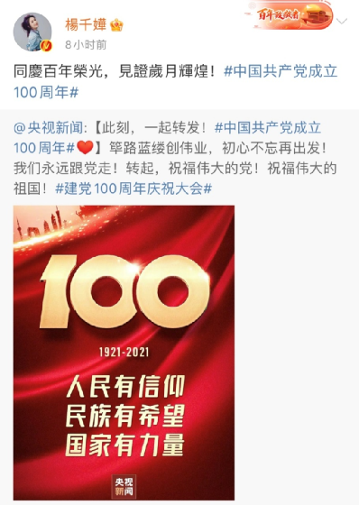 香港藝人楊千嬅則寫道:“同慶百年榮光,見證歲月輝煌!”↓