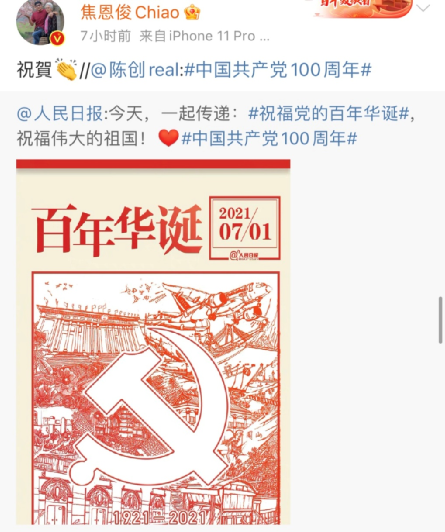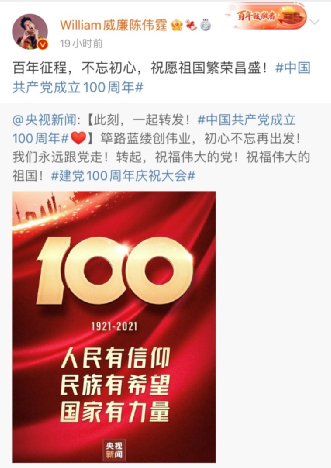 香港藝人陳偉霆發(fā)博稱,“百年征程,不忘初心,祝愿祖國繁榮昌盛!”↓