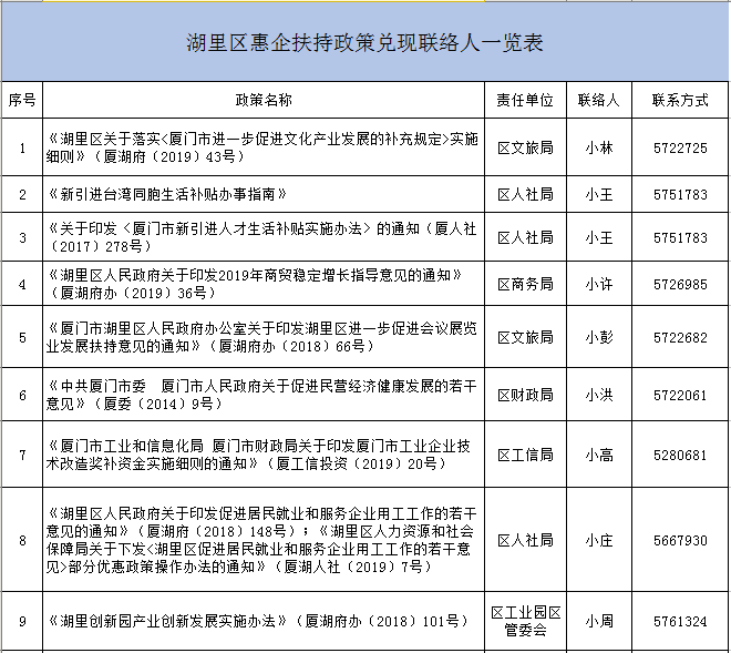 1.全面加快各項(xiàng)惠企扶持政策兌現(xiàn)進(jìn)度。對于原計(jì)劃在年內(nèi)完成兌現(xiàn)的各項(xiàng)惠企政策,各行業(yè)主管部門通過采取簡化程序、容缺受理等方式,設(shè)立綠色通道,加快政策兌現(xiàn)進(jìn)度,力爭在一季度完成兌現(xiàn),原則上不晚于上半年。(政策名稱、責(zé)任單位、聯(lián)絡(luò)人及聯(lián)系方式等詳見表格)
