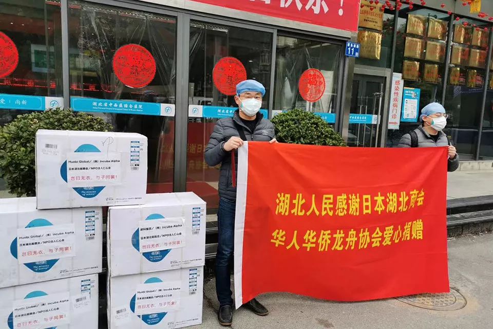 貼著“豈曰無衣,與子同裳”的物資送達(dá)武漢當(dāng)?shù)蒯t(yī)院。(日本湖北商會供圖/圖)