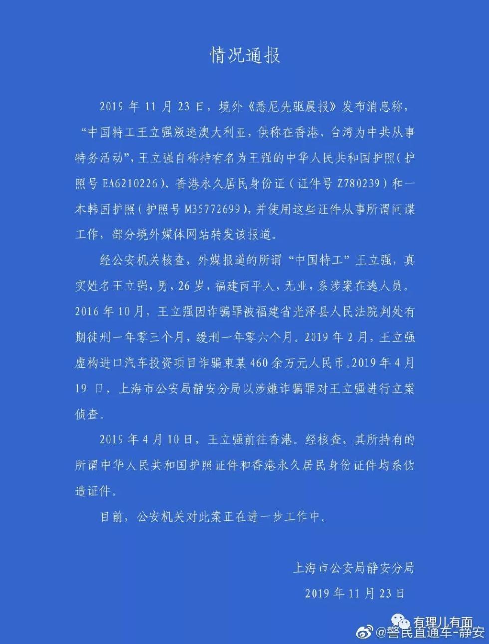 去年4月初,發(fā)現(xiàn)被騙的束某到上海市公安局報案,舉報王立強(qiáng)和妻子的詐騙行為。2019年11月23日在澳大利利亞媒體曝出王立強(qiáng)自稱“中國特工”去澳尋求庇護(hù)后,上海警方發(fā)布了情況通報稱“2019年2月,王立強(qiáng)虛構(gòu)進(jìn)口汽車投資項(xiàng)目詐騙束某460余萬元人民幣。2019年4月19日,上海市公安局靜安分局以涉嫌詐騙罪對王立強(qiáng)進(jìn)行立案偵查。”