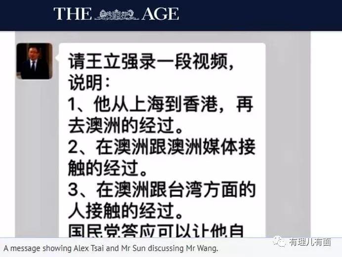 據(jù)報道,王立強還收到蔡和孫提供的劇本和指令:錄制、發(fā)表一段視頻,指控是臺灣的民進黨給了他“一大筆錢”讓他在特工的事情上說謊。如果按指令行事,他將可以返回中國或者臺灣,并得到經(jīng)濟好處。但是,如果不照辦,他將被遣返中國面對死刑,甚至可能會在澳大利亞受到報復(fù)。