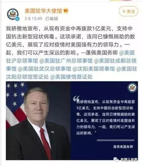 沒辦法,反華政客嘴里吐不出象牙來,一貫如此。就在最近中國奮力抗擊疫情期間,先是美國商務部長威爾伯⋅羅斯發(fā)出“疫情有助于加速工作機會回流美國”的卑劣言論,而后就是美國國務卿蓬佩奧的烏龍援助。