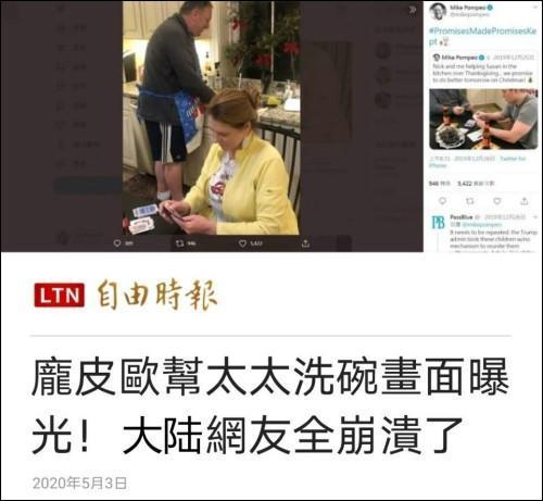 不知怎地,它就被《自由時(shí)報(bào)》注意到了,還聲稱(chēng)蓬佩奧幫太太洗碗的照片在大陸微博上被網(wǎng)友瘋轉(zhuǎn)。