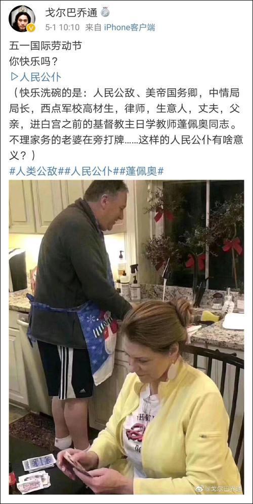 原來(lái)啊,五一勞動(dòng)節(jié)當(dāng)天,一位微博網(wǎng)友又翻出了蓬佩奧去年圣誕節(jié)休假期間在家下廚的照片,然后陰陽(yáng)怪氣了一番。