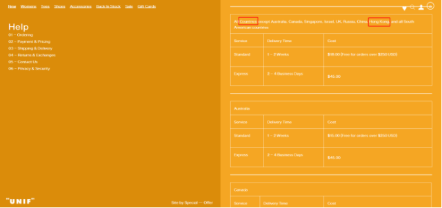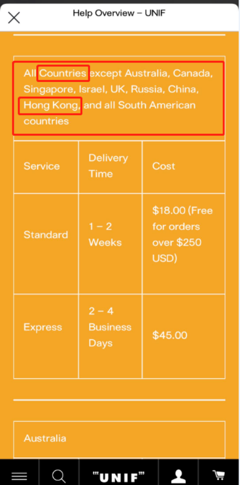 搜索UNIF 的手機(jī)app及官方網(wǎng)站發(fā)現(xiàn),在其help overview(幫助概覽)關(guān)于shipping& Delivery(裝運(yùn)和交貨)的說明中,確實(shí)存在將香港列為“國家”,與澳大利亞、加拿大、新加坡、以色列、英國、俄羅斯及中國并列的情況。↓