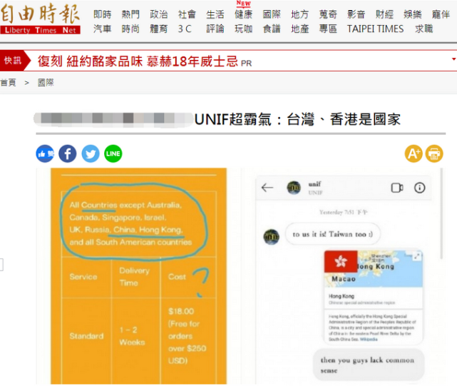 臺(tái)灣《自由時(shí)報(bào)》5月6日?qǐng)?bào)道稱,美國洛杉磯潮牌“UNIF”最近表態(tài)力挺臺(tái)灣、香港為“國家”。該篇報(bào)道稱,一名大陸網(wǎng)友在用UNIF的手機(jī)app查看價(jià)格時(shí)發(fā)現(xiàn),香港被列在“國家”中,而非“國家或地區(qū)”,還與澳大利亞、加拿大、新加坡、以色列、英國、俄羅斯及中國并列,明顯與中國分開,引發(fā)這名網(wǎng)友不滿。