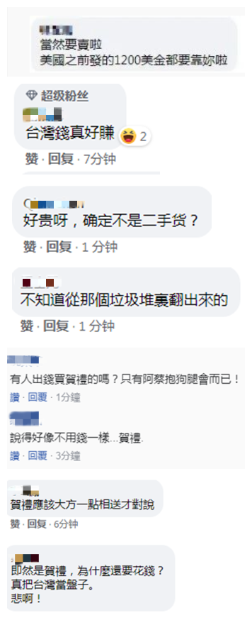 對此,有島內(nèi)網(wǎng)友對此表示,“不知道從哪個垃圾堆里翻出來的”,“確定不是二手貨?”。還有網(wǎng)友對“賀禮”一說一針見血稱,“既然是賀禮,為什么要花錢”,“說得好像不用錢一樣”。