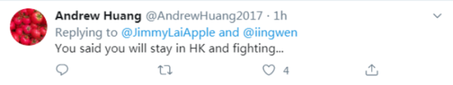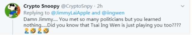 “該死的吉米(黎智英)......你遇到了那么多政客,但你什么也沒學(xué)到。你不知道蔡英文就是在玩你嗎????”