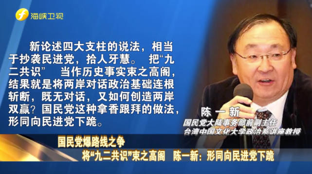 對此,國民黨大陸事務(wù)部前副主任陳一新認(rèn)為,新論述四大支柱的說法,相當(dāng)于抄襲民進(jìn)黨,拾人牙慧。他直言把“九二共識”當(dāng)作歷史事實(shí)束之高閣,結(jié)果就是將兩岸對話政治基礎(chǔ)連根斬?cái)?,既無對話,又如何創(chuàng)造兩岸雙贏?國民黨這種拿香跟拜的做法,形同向民進(jìn)黨下跪。