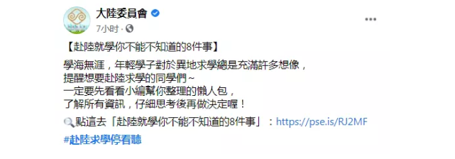 近日,民進黨當局陸委會發(fā)布一個懶人包,叫做“陸委會報你知:赴中國大陸就學你不可不知道的8件事”。看到這個名字我們可能會感到好奇,民進黨當局是真鼓勵咱們臺灣學生赴大陸求學嗎?還記得去年12月底不是還出臺限制措施,要求全臺各級學校凡是有兩岸文教交流活動,都必須跟教育部門報備的嗎?仔細一看內(nèi)容,原來是自己想多了,民進黨這次葫蘆里賣的的藥跟2018年陸委會發(fā)布的“臺生專區(qū):臺生赴陸發(fā)展??绰?rdquo;八則自問自答基本一致。陸委會用八幅自問自答式的圖文“聲情并茂”地來恫嚇臺灣青年學生去大陸讀書要小心喔!