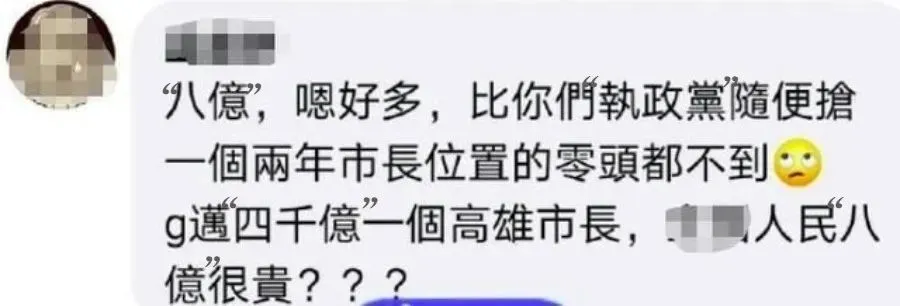 還有島內(nèi)網(wǎng)友質(zhì)疑,臺行政機構(gòu)負責(zé)人蘇貞昌為陳其邁助選撒幣4000億新臺幣給高雄,為臺灣人民花8億元新臺幣做入境普篩就很貴?