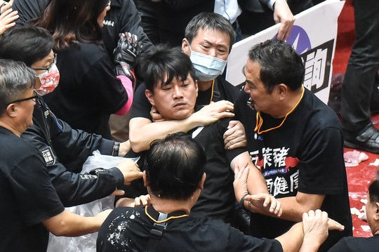 為了美豬進(jìn)口一事,藍(lán)綠在“立法院”大打出手,一時(shí)間豬內(nèi)臟在議場(chǎng)內(nèi)橫飛,引發(fā)海內(nèi)外輿論關(guān)注;而陳柏惟被林為洲鎖喉的畫面,更讓兩人登上島內(nèi)新聞熱搜榜。莊重的民意殿堂,經(jīng)這么一折騰,儼然成為斗獸場(chǎng)。