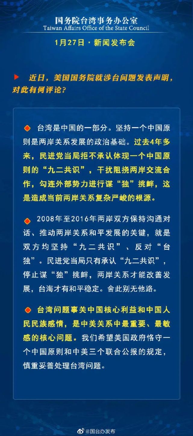 臺灣TVBS電視臺記者:大陸軍機最近頻繁出現(xiàn)在臺灣“西南防空識別區(qū)”,美國國務院呼吁“大陸停止對臺灣施壓”,并且希望“能夠和臺灣進行有意義的對話”?請問發(fā)言人對此有何評論。