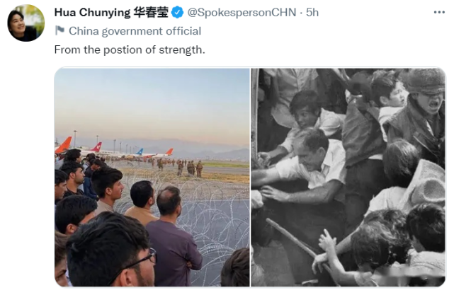 華春瑩先是說(shuō),“人們?cè)?975年的越南見到這一幕,現(xiàn)在又在阿富汗見到這一幕”。
