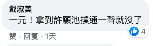 這個(gè)超低賠償金額也引起島內(nèi)熱議。有網(wǎng)友諷刺:“一元的侮辱性極強(qiáng)??!”“一元!拿到許愿池?fù)渫ㄒ宦暰蜎]了!”“原來用愛發(fā)電只值一元?”