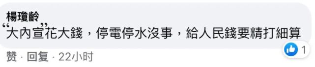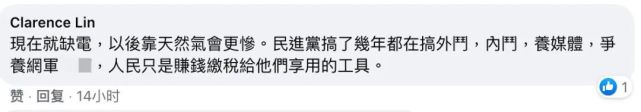 還有網(wǎng)友痛批:“現(xiàn)在就缺電,以后靠天然氣會(huì)更慘。民進(jìn)黨搞了幾年都在搞外斗、內(nèi)斗,養(yǎng)媒體,爭養(yǎng)網(wǎng)軍,民眾只是賺錢繳稅給他們享用的工具。”“‘大內(nèi)宣’花大錢,停電停水沒事,給人民錢要精打細(xì)算。”