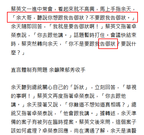 蔡英文17日一進(jìn)中常會,看起來就不高興,馬上手指余天,“余大哥,聽說你想跟我告御狀?不要跟我告御狀。”余天隨即回答,“我就是要告御狀?。?rdquo;蔡英文指著卓榮泰說,“你去跟他講。”