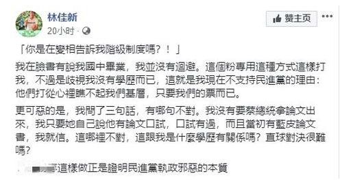 對此,林佳新7日晚間在個人臉書發(fā)文回應(yīng)。他開頭便質(zhì)問,“你是在變相告訴我階級制度嗎?!”林佳新說,自己從未回避只有國中(初中)畢業(yè),“你們民進黨的粉絲用這種方式打我,不過是歧視我沒有學(xué)歷。這就是我現(xiàn)在不支持民進黨的理由,他們打心里瞧不起我們基層,只是要我們的票而已。”林佳新還表示,這些民進黨粉絲的抹黑與攻擊,恰恰證明了“民進黨執(zhí)政的邪惡本質(zhì)”。