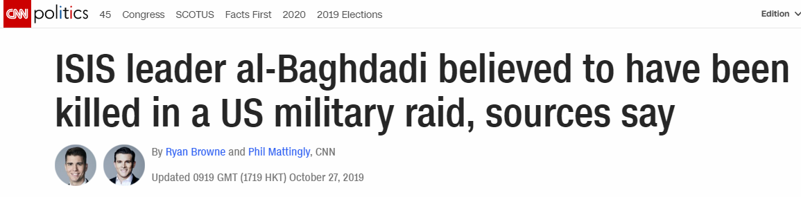 雖然霍根和特朗普本人尚未透露“重大聲明”會與什么事情有關(guān),但由于多家外媒報稱恐怖組織“IS”頭目巴格達(dá)迪(Abu Bakr al-Baghdadi)在美軍行動中死亡,大部分臺媒在報道特朗普即將發(fā)表聲明一事時,都把聲明內(nèi)容和巴格達(dá)迪死亡消息結(jié)合起來。