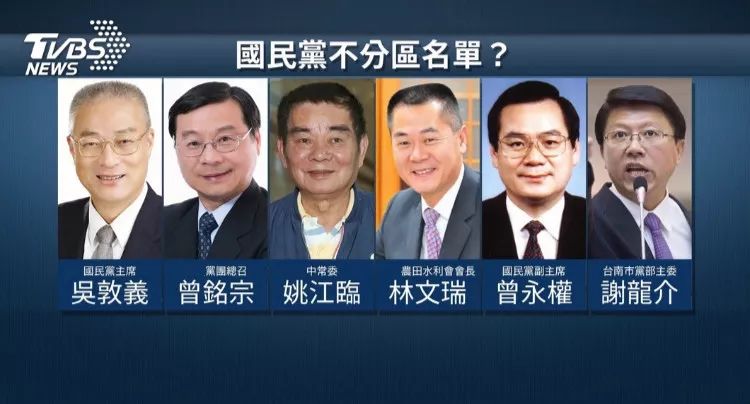 國民黨主席吳敦義、副主席曾永權、中常委姚江臨、“立法院”黨團總召曾銘宗、全臺農(nóng)田水利會會長林文瑞、臺南市黨部主委謝龍介,這份名單被稱為“老人名單”。