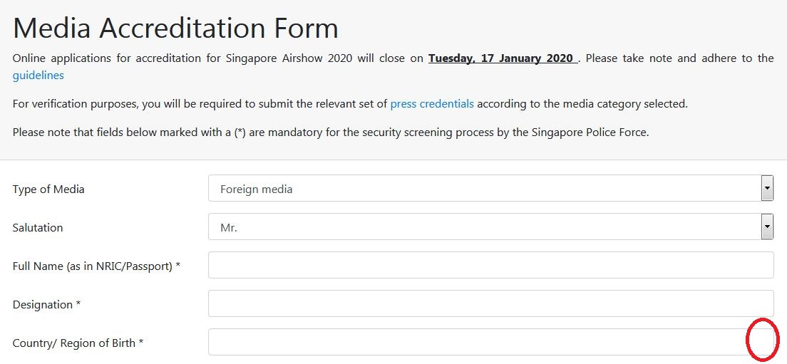 經(jīng)觀察者網(wǎng)查證發(fā)現(xiàn),截止目前,新加坡航展官方網(wǎng)站的記者證申請頁面已取消了相關(guān)下拉菜單,包括“出生國家/地區(qū)”和“工作國家/地區(qū)”等空格,需由申請者自行填寫。