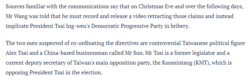 這篇報(bào)道的核心內(nèi)容,則是宣稱王立強(qiáng)在去年圣誕節(jié)期間,遭到了來(lái)自中國(guó)國(guó)民黨副秘書長(zhǎng)蔡正元和大陸商人孫天群的“死亡威脅”。Nick McKenzie和周安瀾在報(bào)道中稱,蔡和孫威脅王立強(qiáng)錄制一段視頻,并要求王立強(qiáng)不僅要在視頻中撤回之前在澳大利亞媒體上的所有說(shuō)法,比如他是間諜和香港商人向心是間諜頭子等言論,他們還讓王立強(qiáng)指控民進(jìn)黨行賄給他,以此干涉臺(tái)灣馬上就要開始的“大選”。