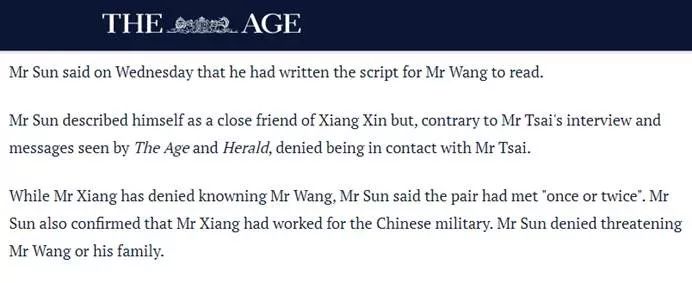 可如果各位拿著這段周采訪錄音,再去對(duì)照前面我們提到的周安瀾和Nick McKenzie所撰寫的報(bào)道,就會(huì)發(fā)現(xiàn)這兩個(gè)澳洲記者幾乎完全刪掉了采訪中孫天群說出的所有對(duì)王立強(qiáng)、民進(jìn)黨以及澳洲媒體的報(bào)道“不利”的內(nèi)容,尤其是孫天群明確指出“民進(jìn)黨答應(yīng)給錢的內(nèi)容是王立強(qiáng)告訴他的”這個(gè)信息。結(jié)果,原本15分鐘的采訪,在他們的報(bào)道中只剩下了很短的三句話。而且這倆澳洲記者還將孫天群澄清向心身份的內(nèi)容斷章取義,刪掉了孫天群明確表示向心早已不在軍工口工作的事情。