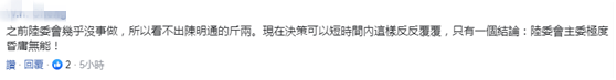 臺“陸委會”政策一變再變,引起了島內(nèi)網(wǎng)友的批評。有人稱,“之前陸委會幾乎沒事做,所以看不出陳明通的斤兩?,F(xiàn)在決策可以短時間內(nèi)這樣反反覆覆,只有一個結(jié)論:陸委會主委極度昏庸無能!”