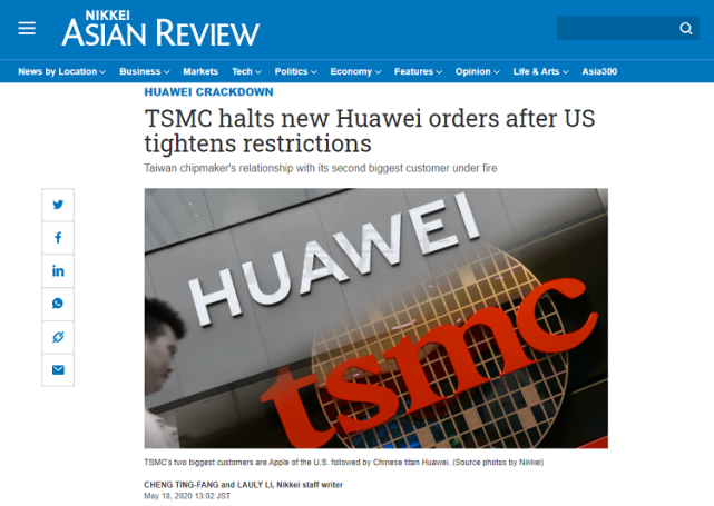 今天上午,日經(jīng)新聞出了一條快訊,說臺積電已經(jīng)停止接受華為的新訂單。