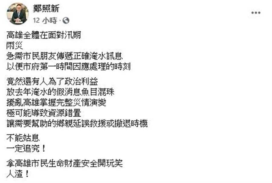 據(jù)臺(tái)灣“中時(shí)電子報(bào)”報(bào)道,臺(tái)灣知名論壇PTT高雄版有網(wǎng)友專門發(fā)文整理高雄各地的積水狀況,卻被人踢爆其中不少照片竟用的是2018年新聞中的舊圖,遭怒轟“這些人到底居心何在!”為此,就連高雄市政府新聞局長(zhǎng)鄭照新也親上一線反駁,怒轟“用假消息魚目混珠,拿高雄市民生命財(cái)產(chǎn)安全開(kāi)玩笑,根本是人渣”。