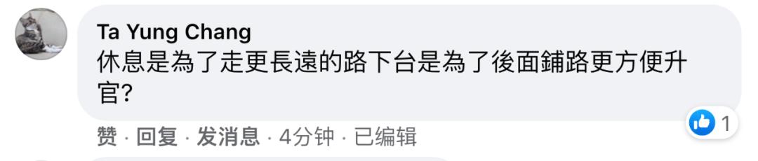 還有網(wǎng)友表示:“斷尾求生。”“休息是為了走更長(zhǎng)遠(yuǎn)的路,下臺(tái)是為了后面鋪路更方便升官?”“風(fēng)頭過(guò)了不是高升就是選下屆屏東縣長(zhǎng)。”“等著升官咯!這是民進(jìn)黨的升官邏輯。”