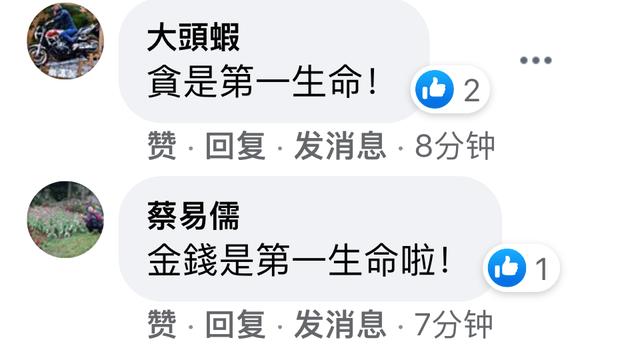 對(duì)此,島內(nèi)網(wǎng)友紛紛留言表示:“貪是第一生命!”“金錢(qián)是第一生命啦!”