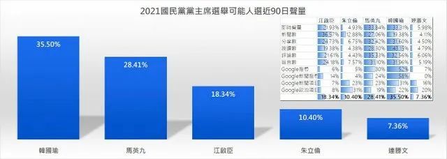 1月3日,“聲量看政治”臉書粉專列出可能參選國民黨主席的五位人選聲量,前高雄市長韓國瑜居首35.5%,其次是馬英九28.41%,第三為黨主席江啟臣18.34%,第四為前主席朱立倫10.4%,第五為國民黨智庫副董事長連勝文7.36%。