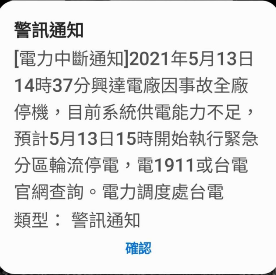 2017年8月15日下午,臺灣經(jīng)歷了有史以來最大規(guī)模的無預(yù)警停電,當(dāng)時總共造成全臺668萬戶瞬間用電受影響,17縣市出現(xiàn)大規(guī)模停電,比例超過臺灣總用戶的一半。