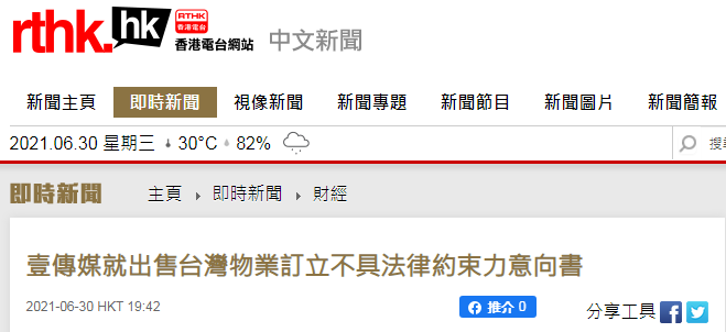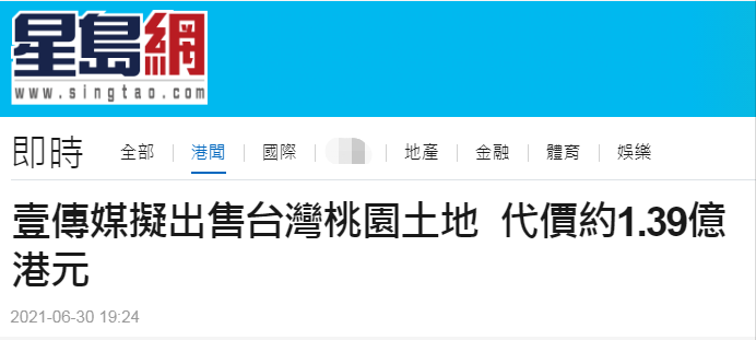 【環(huán)球網(wǎng)報(bào)道 記者 康博浩】據(jù)香港“星島網(wǎng)”和香港電臺網(wǎng)站消息,壹傳媒30日公布,將以約1.39億港元(約合1.55億人民幣)的價(jià)格,出售位于臺灣桃園的若干土地及土地上的大樓。