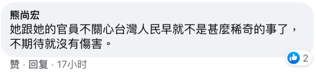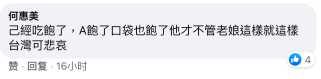 還有網(wǎng)友痛批:“已經(jīng)吃飽了,A飽了,口袋也飽了,(其他)才不管,臺灣可悲哀!”“她跟她的官員不關心臺灣民眾早就不是什么稀奇的事了,不期待就沒有傷害!”“發(fā)大財才是蔡英文唯一的考量算計關切之點。”