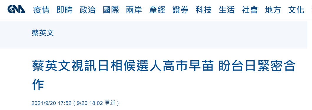 據(jù)臺灣“中央社”消息,蔡英文20日與正在參選日本自民黨總裁的眾議院議員高市早苗進行視頻會談。民進黨聲稱,在視頻會上,“兩人就區(qū)域安全、經(jīng)濟情勢與產(chǎn)業(yè)供應鏈等交換意見”。對此,有島內(nèi)網(wǎng)友質(zhì)疑蔡英文此舉是在“押寶”嗎?還有網(wǎng)友提醒蔡英文,拜登當選還沒受教訓嗎?