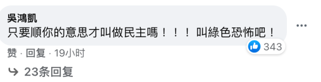 此帖文一發(fā)出,引發(fā)島內(nèi)網(wǎng)友熱議。有網(wǎng)友大呼:“只要順你的意思才叫‘民主’嗎?叫綠色恐怖吧!”