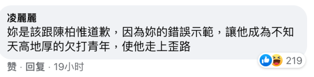 也有網(wǎng)友諷刺:“你是該跟陳柏惟道歉,因?yàn)槟愕腻e(cuò)誤示范,讓他成為不知天高地厚的欠打青年,使他走上歪路!”