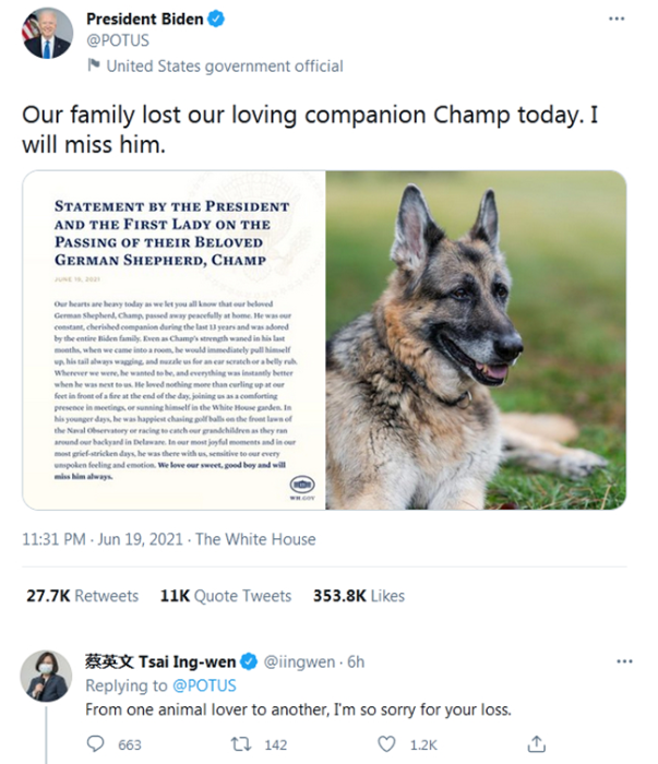 據(jù)“觀察者網(wǎng)”報道,2021年6月19日,美國總統(tǒng)拜登在推特宣布,他的愛犬“冠軍”(Champ)去世。這則“訃告”很快引發(fā)眾多美國網(wǎng)民關(guān)注,數(shù)以萬計的悼念留言中,臺灣地區(qū)領(lǐng)導人蔡英文顯得格外醒目,她的這條評論也很快“翻車”。島內(nèi)網(wǎng)民們批評蔡英文無視因疫情去世和接種疫苗后猝死的臺灣民眾,卻跑去哀悼美國總統(tǒng)的狗,因為那一天,臺灣地區(qū)新增127例本土確診病例、20例死亡病例,卻未見蔡英文“痛心”。